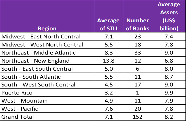 The distribution of the liquidity index is uniform across US regions (except New England where there are some banks with a rather high STLI) as you can see on the table below.