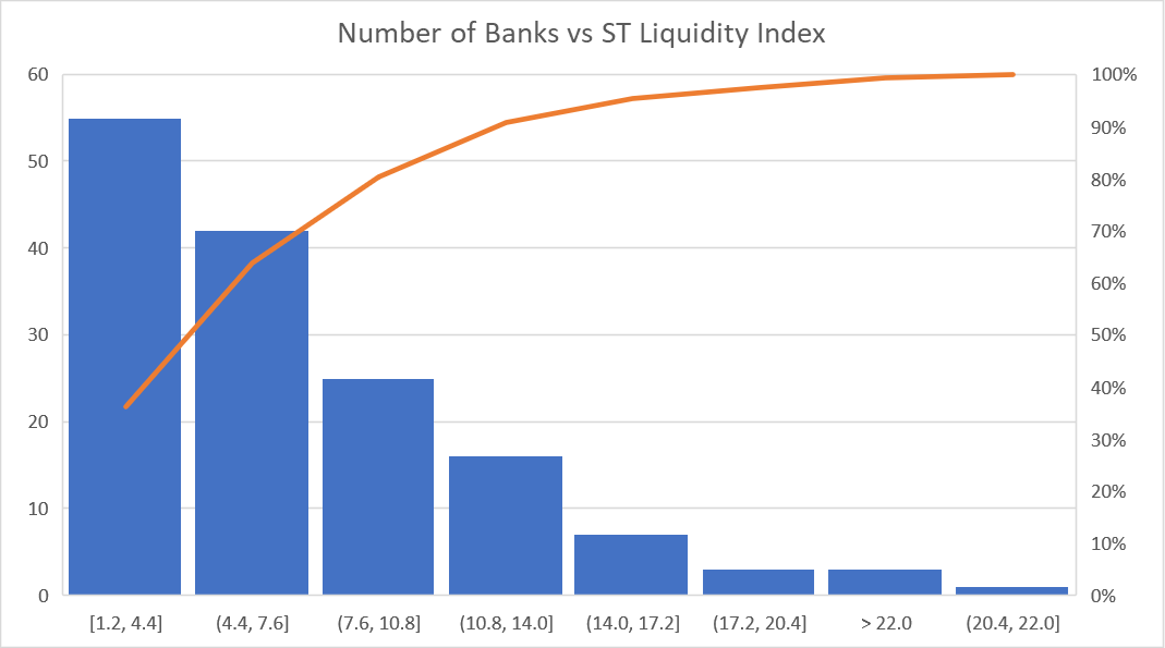 We considered banks between $5bi and $15bi in assets as reported in September 2023. The US has over 150 banks with a median STLI of 5.6, which means that short term assets are 17% of their liabilities, what is not far from what anecdotally we get as a reasonable level when talking to bank treasurers